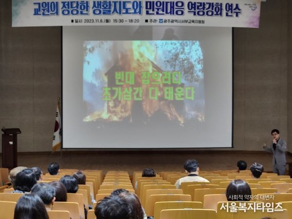 서울복지타임즈 이득형 기자 | 광주서부교육지원청이 지난 6일 관내 교원을 대상으로 ‘정당한 생활지도 이해와 민원 대응 역량 강화’ 특강을 실시했다.