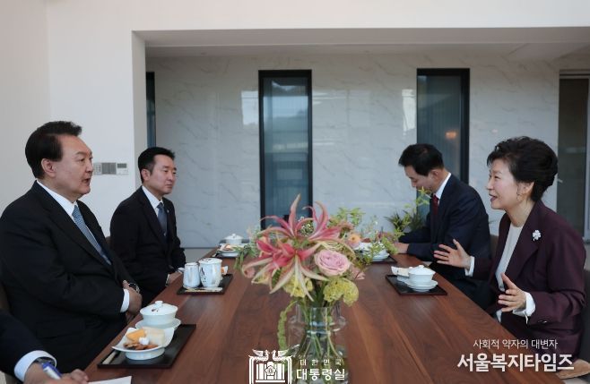 윤 대통령과 박 전 대통령은 거실에서 강승규 시민사회수석, 이도운 대변인, 유영하 변호사가 배석한 가운데 즐겁고 화기애애한 분위기에서 1시간 가량 환담했다. 박 前 대통령은 차와 과일을 냈는데, 윤 대통령이 차 중에서도 밀크티를 좋아한다는 걸 알고 홍차와 우유를 미리 준비했다. 홍차의 농도도 윤 대통령의 선호를 미리 파악해 맞췄다고 합니다. 과일은 윤 대통령이 좋아하는 감과 배를 정성스레 준비했다.