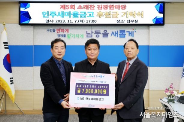 서울복지타임즈 이득형 기자 | 인천시 남동구는 최근 구청장 집무실에서 인주새마을금고로부터 제5회 남동구 소래찬 김장한마당의 성공적인 개최를 위한 후원금 700만 원을 전달받았다고 8일 밝혔다.