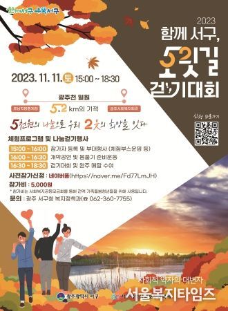 서울복지타임즈 이득형 기자 | 광주광역시 서구는 주민의 관심과 ‘발걸음’으로 가족돌봄청년에게 희망을 주고 행복한 삶을 지원하기 위해 ‘함께 서구, 오~! 잇길 걷기대회’를 오는 11일 오후 3시 광주천 일대에서 개최한다.