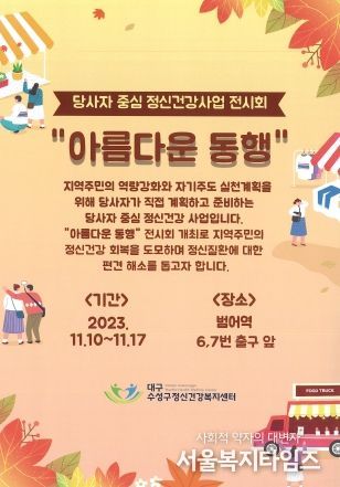 서울복지타임즈 이득형 기자 | 대구 수성구보건소는 정신건강복지센터와 함께 오는 10일부터 17일까지 대구 도시철도 2호선 범어역 대구아트웨이 오픈갤러리에서 정신장애인 작품 전시회 ‘아름다운 동행’을 개최한다.
