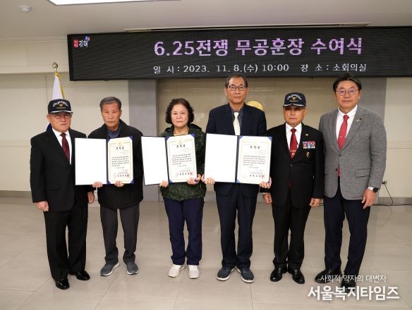서울복지타임즈 이득형 기자 | 김해시는 8일 김해시청 소회의실에서 6·25전쟁에 참전해 공을 세운故안동수 하사, 故구득영 상병, 故박동석 상병의 유가족에게 국방부장관을 대신하여 화랑무공훈장을 전달하는 전수식을 가졌다.