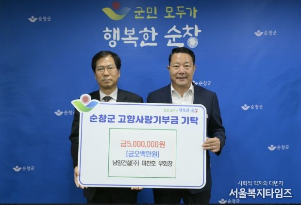 서울복지타임즈 이득형 기자 | 순창군은 8일 전남 나주시에 소재하고 있는 남양건설(주) 마찬호 부회장이 고향사랑기부금 개인 최고액인 500만원을 기탁했다고 밝혔다.