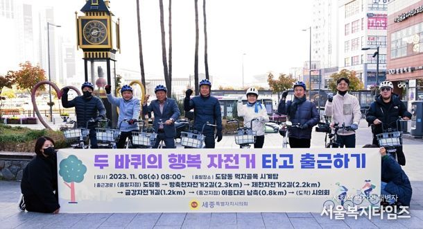 서울복지타임즈 이득형 기자 | 세종특별자치시의회는 8일 오전 8시부터 도담동 먹자골목 시계탑에서 ‘두 바퀴의 행복, 자전거 타고 출근하기’ 행사를 진행했다.