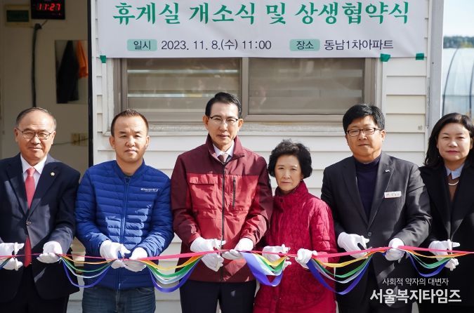 서울복지타임즈 이득형 기자 | 충남 서산시는 8일 서산시비정규직지원센터 주관으로 동남1차아파트에서 경비‧미화노동자 휴게실 개소식과 상생협약식이 개최됐다고 밝혔다