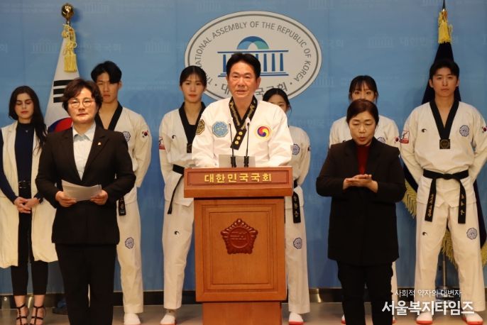 서울복지타임즈 이득형 기자 | 이동섭 국기원장(가운데)과 조수진 국회의원(국민의 힘)이 11월8일 국회 소통관에서 2030 세계박람회 부산 유치를 위해 태권도인들과 전 국민이 힘을 모아 달라는 내용의 기자회견을 열었다.