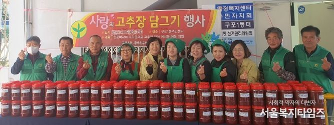 서울복지타임즈 이득형 기자 | 부산 북구 구포1동 행정복지센터는 동 새마을부녀회와 협의회에서 11월 6일부터 7일까지 ‘사랑의 고추장 담그기 행사’를 진행했다고 밝혔다.