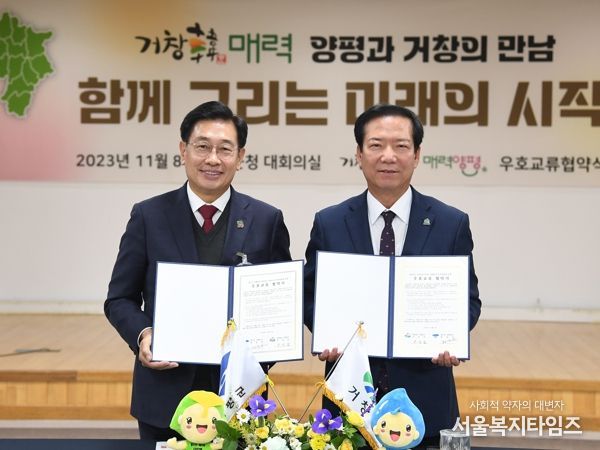서울복지타임즈 이득형 기자 | 거창군은 지난 8일 양평군청에서 양평군과 미래 지향적인 협조체계 구축 및 공동 발전과 번영을 위한 우호교류 협약을 체결했다.