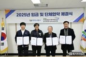 서울복지타임즈 이재연 기자 | 여주도시공사와 민주노총 공공운수노조 여주도시공사지회는 12월 9일 여주도시공사 사옥에서 2025년 임금 및 단체협약 체결식을 개최했다고 밝혔다. 이번 협약은 상호 신뢰와 존중을 바탕으로 진행된 성실한 교섭의 결실로, 노사 상생과 지속 가능한 발전을 위한 중요한 발판이 될 전망이다. 공사와 노동조합은 이번 협약을 통해 직원들이 안정적인 근무여건 아래 역량을 발휘할 수 있는 환경을 조성하고, 공공기관으로서 사회적 책임을 다하기 위한 제도 개선과 협력 체계를 강화해 나갈 방침이다. 임명진 사장은 “이번 임금·단체협약은 노사 간 소통과 이해를 바탕으로 이루어낸 결실”이라며, “앞으로도 신뢰 기반의 노사 협력을 통해 시민에게 더 나은 공공서비스를 제공할 수 있도록 노력하겠다"고 밝혔다. 여주도시공사는 앞으로도 합리적인 노사관계 정착을 위해 소통과 협력을 강화하고, 시민 중심의 공기업으로서 책임과 역할을 다하기 위한 다양한 노력을 이어갈 계획이다.