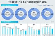서울복지타임즈 이재연 기자 | 국토교통부는 2025년 12월 기준 주택 통계를 공표했다. 2025년 12월 주택 인허가, 착공, 분양, 준공 실적은 12월 수도권 인허가는 82,077호로 전년동월(119,541호) 대비 31.3% 감소, 12월 누적 실적은 222,704호로 전년동기(234,083호) 대비 4.9% 감소했다. 서울 지역 12월 인허가는 2,576호로 전년동월(18,441호) 대비 86.0% 감소, 12월 누적 실적은 41,566호로 전년동기(51,452호) 대비 19.2% 감소했다. 비수도권 12월 인허가는 20,712호로 전년동월(39,904호) 대비 48.1% 감소, 12월 누적 실적은 157,130호로 전년동기(201,151호) 대비 21.9% 감소했다. 12월 수도권 착공은 40,344호로 전년동월(29,965호) 대비 34.6% 증가, 12월 누적 실적은 166,823호로 전년동기(163,255호) 대비 2.2% 증가했다. 서울 지역 12월 착공은 10,050호로 전년동월(3,620호) 대비 177.6% 증가, 12월 누적 실적은 32,119호로 전년동기(26,