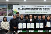 서울복지타임즈 이재연 기자 | 장수군은 장수한우지방공사, 이티바이오텍(주), 전북대학교와 장수군청 회의실에서 장수한우 품질 고급화를 위한 ‘장수형 저탄소 종모우 개발’ 공동연구 상호협력 업무협약(MOU)을 체결했다고 11일 밝혔다. 이번 협약은 협약기관 간 상호 업무협조 체계를 구축해 장수 한우 산업의 경쟁력을 높이기 위한 장수 지역 사양환경에 적합한 우수 유전자원을 확보하고, 탄소배출을 줄이면서도 생산성과 품질을 높일 수 있는 종모우 개발을 위해 마련됐다. 특히 종모우 개발을 통해 장수 한우 고유의 유전형질을 확립하고 탄소배출 저감과 생산성 향상을 동시에 달성하는 것이 핵심 목표다. 협약에 따라 군은 저탄소 종모우 개발을 위한 사업 총괄 및 행·재정적 지원을 하고 장수한우지방공사는 채정·가공·사양관리와 농가 컨설팅에 나선다. 또한 이티바이오텍은 유전체 기반 연구개발을 진행하고 전북대학교는 유전 능력 평가와 우량 암소·후보 종모우 선발을 각각 담당한다. 장수군은 이번 공동연구를 최근 지정된 전북특별자치도 농생명산업지구 내 ‘저탄소한우 산업지구’ 조성사업과 연계해 2030년까지 단계적으로