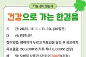 서울복지타임즈 이재연 기자 | 광양시는 지역 주민의 건강생활 실천을 돕기 위해 11월 1일부터 30일까지 모바일 걷기 앱 '워크온'에서 ‘건강으로 가는 한걸음 11월 걷기 챌린지’를 운영한다고 밝혔다. 이번 걷기 챌린지는 1걸음당 1마일리지가 적립되며, 1일 최대 8천 마일리지가 누적된다. 기간 중 20만 보를 달성하면 20만 마일리지가 쌓여 모바일상품권(5천 원권) 응모가 가능하다. 시는 목표 걸음을 달성한 참여자 중 추첨을 통해 800명에게 상품권을 지급할 예정이다. 참여를 희망하는 시민은 모바일 걷기 앱 ‘워크온’을 설치하고 ‘광양시 공식 커뮤니티’에 가입한 뒤, 챌린지 탭에서 광양시 걷기 챌린지 참여하기를 누르고 목표 마일리지가 쌓일 때까지 스마트폰을 소지하고 걸으면 된다. 광양 지역 제한이 설정되어 있어 참여 시 휴대폰 위치 설정을 반드시 켜야 하며, 자세한 사항은 광양시보건소로 문의하면 된다. 반미순 건강증진과장은 “걷기는 체력 증진은 물론 스트레스 해소에도 큰 도움이 된다”며 “걷기 좋은 계절인 가을, 시민 여러분의 많은 참여를 바란다”고 말했다.