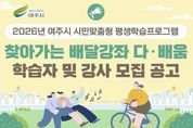 서울복지타임즈 이재연 기자 | 여주시는 시민 누구나 원하는 시간과 장소에서 배움을 이어갈 수 있도록 지원하는 2026년 시민 맞춤형 평생학습 프로그램 ‘찾아가는 배달강좌’의 학습자와 강사를 모집한다고 밝혔다. ‘찾아가는 배달강좌’는 여주시민 또는 관내 사업체 근로자 7명 이상이 학습모임을 구성해 강좌를 신청하면, 전문 강사가 직접 찾아가 강의를 진행하는 학습자 중심의 평생학습 프로그램으로 이 사업은 평생학습 접근성을 높이고, 학습 사각지대 해소와 공동체 기반 학습문화 확산에 기여하고 있다. 학습자 ‘다·배움’모집은 2026년 2월과 5월(각 1~10일) 진행되며, 선정된 학습모임은 강좌당 최대 20시간 이내에서 무료로 교육을 받을 수 있으며, 강사 ‘다·선생’모집은 1월과 4월(각 20~25일) 두 차례 진행되며, 선정된 강사는 학습모임과 매칭돼 강의를 진행한다. 특히, 2026년부터는 기존 일반강좌 외에도 정책 연계형 특화강좌가 새롭게 운영되어 ▲경력단절 여성의 사회 재도약 ▲생활밀착형 생성형 AI 활용 교육 ▲농업·생태·전통문화 융합형 미래인재 양성 등 시민의 생애주기와 지역 특성을 반영한 맞춤형 학습으로,