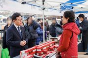서울복지타임즈 이재연 기자 | 진교훈 서울 강서구청장이 5일 마곡광장에서 열린 ‘설맞이 농특산물 직거래장터’를 찾았다. 이날 진 구청장은 장터 내 점포 곳곳을 들려 임실치즈, 밀양딸기 등 지역 농특산물을 직접 구입하고 상인들과 장을 보러 나온 주민들에게 다가가 친근하게 새해 인사를 나눴다. 설맞이 직거래장터는 오는 6일(금)까지 계속된다. 운영시간은 오전 10시부터 오후 6시까지다. 장터에는 임실군, 상주시, 태안군, 강릉시, 여수시, 함안군, 순천시, 정읍시, 괴산군, 완주군, 평창시, 남원시, 밀양시, 청양군, 논산시 등 15개 지자체에서 39개 업체가 참여했으며, 각 지역의 다양한 농특산물을 시중보다 저렴하게 구입할 수 있다. 특히, 장터에선 강서구 특산품인 ‘경복궁 쌀’과 이를 원료로 만든 ‘나루생막걸리’도 함께 선보여 방문객들의 발길을 사로잡았다. 진교훈 구청장은 “장터에 나오셔서 각 지역의 농특산물을 합리적인 가격으로 구매해 보시길 바란다”고 말했다.