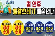 서울복지타임즈 이재연 기자 | 고흥군은 설 명절 연휴 기간 동안 생활폐기물로 인한 주민 불편을 최소화하고 쾌적한 생활환경을 유지하기 위해 설 연휴 생활폐기물 관리대책을 수립하고 본격 추진한다고 밝혔다. 군은 2월 14일부터 15일까지는 설 명절에 발생한 생활폐기물을 정상 수거하며, 이 기간 환경미화원 등 약 100명을 투입해 평소와 같이 안정적인 수거 서비스를 제공할 계획이다. 이어 2월 16일부터 18일까지는 연휴 중 발생하는 생활폐기물로 인한 불편을 최소화하기 위해 생활폐기물 기동반을 운영한다. 기동반은 2개 반 6명으로 구성되며, 고흥읍과 도양읍 시가지를 비롯한 상가 밀집지역을 중심으로 우선 수거를 실시하고, 긴급 민원이 발생하면 신속히 처리할 예정이다. 또한, 군은 연휴 기간 생활폐기물 적체와 무단 배출을 예방하기 위해 주요 도로변과 다중이용시설 주변을 중심으로 현장 관리를 강화한다. 아울러 수거 일정과 배출 요령을 군민에게 널리 알리기 위해 마을방송을 통한 읍·면별 안내를 실시하고, 주요 시가지 현수막 게시, 청사 및 고흥읍·도양읍 전광판 송출, 언론 보도 등 다양한 홍보 활동