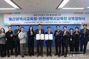 서울복지타임즈 이재연 기자 | 울산광역시교육청과 인천광역시교육청이 4일 오후 4시 울산교육청 접견실에서 교육·연구 분야 교류 활성화를 내용으로 하는 업무협약을 했다. 이번 협약은 두 교육청이 상호 신뢰와 협력을 바탕으로 독서·인문교육과 연구 분야 발전을 도모하고, 지역 문제 해결과 사회 공헌을 위한 공동 프로그램 개발을 함께 추진하고자 마련됐다. 두 교육청은 이번 협약으로 교육·연구 분야 교류 활성화를 위한 다양한 프로그램을 공동 운영하고, 상호 연계로 교육 발전을 꾀한다는 방침이다. 또한 지역사회의 문제해결과 공공 가치를 실현하는 사회 공헌 프로그램을 공동 개발하고 운영하는 데 협력하기로 했다. 특히, 울산광역시교육청의 대표 독서인문교육 프로그램 ‘책크인’ 과 인천광역시교육청의 대표 독서교육 프로그램 ‘읽걷쓰’를 연계해 두 기관의 우수 교육 자료(콘텐츠)를 상호 공유하고 발전시킬 계획이다. ‘책크인’은 ‘책으로 크는 우리 아이’와 ‘독서의 세계로 체크인(check-in)한다’는 의미를 담아 학생의 성장과 독서 문화 확산을 목표로 한다. ‘읽걷쓰’는 읽기(문해력), 걷기(기