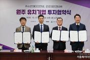 서울복지타임즈 이재연 기자 | 원주시는 27일 오전 11시, 강원특별자치도청 신관 2층 소회의실에서 원강수 시장, 김진태 도지사, 이명심 로로에프엔비㈜ 상무이사, 정동인 ㈜수반에이치앤비 대표이사 등이 참석한 가운데 원주 공장 신설을 위한 투자협약을 체결했다. 이번 협약을 통해 두 기업은 원주 문막반계산업단지와 기업도시에 제조공장을 설립하고, 원주시는 기업의 원활한 투자활동을 위해 행·재정적으로 지원할 방침이다. 로로에프엔비는 원주시 부론면에 소재한 프리미엄 디저트 전문 브랜드로, 자체 브랜드 ‘로로멜로(ROROMALLO)’를 출시하며 ‘프로즌스모어’, ‘아이스브륄레’등 차별화된 100% 수제 프리미엄 디저트를 선보여 소비자와 업계의 큰 관심을 받고 있다. 마켓컬리, GS25, CU, 세븐일레븐 등 다양한 유통채널과의 협업을 확장하고 있으며, 아시아 국가를 대상으로 수출을 확대하는 등 늘어나는 수요에 대응하기 위해 제조공장 신설 투자를 결정했다. 2027년까지 문막반계산업단지(8,214㎡)에 134억 원을 투입해 제조공장을 신설하고, 203명을 신규 고용할 계획이다. ㈜수반에이치앤비는 화장품·건강