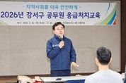 서울복지타임즈 이재연 기자 | 서울 강서구는 26일 오전 10시 강서보건소에서 응급 시 주민의 생명을 구하기 위한 ‘응급처치 실전 교육’을 실시했다. ‘2025년 한국 심폐소생술 가이드라인’에 따르면, 구급대가 이송한 병원 밖 심정지 환자는 2008년 2만 1,905명에서 2024년 3만 3,034명으로 크게 증가했다. 심정지 발생 후 4~5분이 지나면 산소 부족으로 뇌 손상이 시작되기 때문에 구급대 도착 전 목격자의 신속한 대응이 매우 중요하다. 이번 교육은 구청 직원 82명을 대상으로 응급처치의 중요성을 인식하고, 일상생활이나 민원 현장에서 발생할 수 있는 심정지 등 응급상황에 신속하고 정확하게 대응할 수 있는 역량을 강화하기 위해 마련됐다. 특히 최근 발표된 ‘2025년 한국 심폐소생술 가이드라인’의 개정 내용을 반영해 교육의 정확성을 높였다. 최신 지침에 따른 심폐소생술 절차와 자동심장충격기(AED) 사용법 등을 포함해 직원들이 실제 현장에서 당황하지 않고 효과적으로 대처할 수 있도록 구성했다. 교육에는 이대목동병원 이재희 응급의학과 교수를 초빙해 심폐소생술 및 자동심장충격기 사용법 등 주요