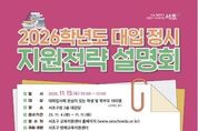 서울복지타임즈 이재연 기자 | 서울 서초구가 수능 이틀 뒤인 11월 15일 오전 10시 서초구청 2층 대강당에서 수험생과 학부모를 위한 ‘2026학년도 대입 정시 지원전략 설명회’를 개최한다고 밝혔다. 수험생들의 필수 코스로 자리 잡은 서초구의 ‘대입 정시 지원전략 설명회’는 ‘교육1번지’ 서초가 매년 수능 직후 가장 빠르게 여는 입시 설명회다. 올해는 국내 최고 수준의 입시 전문가 2명이 120분간 핵심 전략을 압축해 전달하는 ‘올인원(All-in-One)’ 특강으로 진행될 예정으로 수능 직후 빠르게 정시 정보를 얻을 수 있는 자리인 만큼 수험생과 학부모들의 높은 관심이 예상된다. 설명회 1부에서는 임성호 종로학원 대표이사가 ▲2026 정시 합격선 예측 ▲의대정원 축소로 인한 ‘사탐런’(이과생의 사회탐구 응시) 변수 ▲무전공 선발 확대의 파급효과 등 분석으로 수험생들이 급변한 정시 환경 속에서 자신의 위치를 파악하고 전략적으로 지원할 수 있도록 돕는 시간이 마련된다. 이어서 2부에서는 장문성 종로학력개발원장이 ▲대입 일정 체크리스트 ▲대입 경쟁률 예측 ▲수도권 주요 대학 정시 모집요강 등 분석을 통해 수험생과 학부모가 반