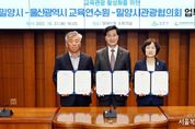 서울복지타임즈 이재연 기자 | 울산교육연수원은 21일 밀양시청 소회의실에서 경남 밀양시, 밀양시관광협의회와 지역 자원을 활용한 현장 체험 연수 지원 등을 내용으로 하는 업무협약을 체결했다. 이번 협약은 밀양시가 보유한 교육 관광 자원을 적극 활용해 교직원의 연수 참여 기회를 확대하고 교직원의 역량을 높이고자 추진됐다. 이번 협약으로 밀양시는 주요 교육 관광 자원의 정보를 제공하고 관광협의회는 프로그램을 연계 지원한다. 울산교육연수원은 이번 협약에 따라 오는 11월 밀양시 단장면에 있는 선샤인 밀양 테마파크에서 지방공무원과 교육공무직원을 대상으로 현장 체험형 연수를 진행할 예정이다. 한현숙 원장은 “이번 협약은 교육, 문화, 관광을 통합한 연수 프로그램 운영의 토대를 마련했다는 점에서 큰 의미가 있다”라며 “앞으로도 지역 자원을 교육 제작물로 적극 활용해 연수생에게 현장 중심의 체험 기회를 제공하겠다”라고 말했다.
