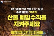 서울복지타임즈 이재연 기자 | 지난 주말 전국 산불 22건 발생 주요 원인은 '부주의' 산불 예방수칙을 지켜주세요 · 산에서 취사, 흡연 등 금지 · 산 근처에서 쓰레기 소각 금지 · 연기, 불씨 보면 119 신고 "불법소각, 꽁초 투기 등 위반 행위 엄정 대응"