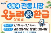 서울복지타임즈 이재연 기자 | 파주시는 2026년 설 명절을 맞아 고물가로 인한 시민들의 가계 부담을 덜고 지역 전통시장 활성화를 도모하기 위해 ‘설맞이 농축산물 온누리상품권 환급 행사’를 실시한다. 이번 행사는 농림축산식품부가 주관하는 ‘농축산물 할인지원’사업의 일환으로, 본격적인 제수용품 구매 기간인ق월 10일부터 14일까지 5일간 관내 전통시장 2곳(봉일천전통시장, 금촌전통시장)에서 진행된다. 행사 기간 동안 참여 점포에서 국산 농축산물을 구매한 고객은 구매 금액에 따라 1만 원 또는 2만 원 상당의 온누리상품권을 환급받을 수 있다. 환급 기준은 ▲구매 금액이 3만 4천원 이상 6만 7천 원 미만일 경우 1만 원 ▲6만 7천 원 이상일 경우 2만 원이며, 환급 한도는 1인당 최대 2만 원이다. 단, 예산 소진 시 행사는 조기 종료될 수 있다. 환급을 희망하는 고객은 당일 구매 영수증과 신분증을 지참해 각 시장 내에 마련된 지정 환급처를 방문하면 된다. 환급 대상 품목은 국산 농산물 및 축산물이며, 수입산 농축산물이나 법인카드 결제 내역, 제로페이 모바일 상품권 결제 내역 등은 환급 대상에서 제