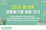 서울복지타임즈 이재연 기자 | 양주시가 설 연휴 기간 시민과 방문객의 불편을 줄이기 위해 ‘2026년 설 연휴 생활폐기물 관리 대책’을 추진한다. 양주시는 설 연휴가 시작되는 오는 2월 14일부터 18일까지를 특별 관리 기간으로 정하고, 연휴 기간 중 급증하는 생활폐기물로 인한 불편을 최소화할 방침이다. 시는 종량제봉투, 음식물류 폐기물, 재활용품 등 생활폐기물을 2월 14일과 16일 이틀간 정상 수거한다. 공동주택에서 발생하는 음식물류 폐기물은 2월 18일 별도 수거해 연휴 기간 배출된 폐기물이 장기간 방치되는 것을 막을 계획이다. 또 연휴 기간 중 쓰레기 민원과 긴급 상황에 신속히 대응하기 위해 상황근무반을 편성하는 등 비상 청소체계를 구축·운영한다. 양주시 관계자는 “설 연휴 기간 생활폐기물 발생을 줄이기 위한 시민들의 적극적인 협조가 필요하다”며 “생활폐기물은 정해진 수거 일정에 맞춰 배출해 주시고, 수거일 전날 오후 8시부터 수거일 당일 오전 6시까지 배출 시간을 반드시 지켜달라”고 당부했다.