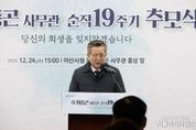 서울복지타임즈 이재연 기자 | 아산시는 24일, 아산시청 앞 故 최종곤 사무관 흉상 앞에서 ‘故 최종곤 사무관 순직 19주기 추모식’을 거행했다. 이번 추모식은 2006년 12월, 공무 수행 중 불의의 사고로 순직한 故 최종곤 사무관의 숭고한 희생과 헌신을 기리고, 시민의 안전을 위해 헌신한 공직자의 사명과 책임을 되새기기 위해 마련됐다. 이날 행사에는 유가족을 비롯해 김범수 아산시 부시장, 맹의석 아산시의회 부의장, 동료 공직자 등 다수가 참석해 고인을 추모했다. 김범수 부시장은 추모사에서 “故 최종곤 사무관은 시민의 안전을 자신의 책무로 여기며 현장에서 묵묵히 소임을 다한 참된 공직자였다”며 “고인의 희생과 헌신은 오늘의 아산시 공직자들에게도 큰 울림과 책임으로 남아 있다.”고 말했다. 이어 “아산시는 고인의 뜻을 잊지 않고, 시민의 안전을 최우선으로 하는 행정을 이어 가겠다”고 밝혔다. 故 최종곤 사무관은 2006년 12월 24일, 송악면 국도 39호선에서 조류인플루엔자 확산 방지 업무를 수행하던 중 과속 차량에 의해 사고를 당해 순직했다. 고인은 생전 성실한 근무와 투철한 책임감으로 동료와