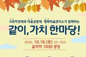 서울복지타임즈 이재연 기자 | 가평군은 오는 18일 오전 10시부터 오후 3시까지 음악역 1939 광장에서 주민과 함께하는 축제 ‘2025년 같이, 가치 한마당’을 연다. 이번 행사는 사회적경제기업의 판로 확대와 마을공동체, 경기행복마을관리소의 활동 성과를 알리고 주민 참여를 확대하기 위해 마련됐다. 행사에는 사회적경제기업 5곳, 마을공동체 16곳, 경기행복마을관리소 4곳 등 총 25개 단체가 참여한다. 이날 주민들은 현장에서 직접 사회적경제기업의 제품을 구매할 수 있으며, 공동체별 특색 있는 프로그램을 즐길 수 있다. 주요 프로그램은 △사회적경제기업 생산품 홍보·판매 △공동체와 경기행복마을관리소 활동 전시 및 무료 체험 △합창·뮤지컬 갈라쇼·힐링체조 등 공연 △경품 이벤트 등이 마련돼 있다. 특히 가평마을교육공동체가 제작한 단편영화 상영 등 주민 주도 콘텐츠도 선보일 예정이다. 가평군 관계자는 “‘같이, 가치 한마당’ 축제를 통해 지역사회에서 사회적경제와 공동체 활동이 더욱 확산되기를 기대한다”며 “이번 행사가 지역경제의 활력으로 이어질 수 있도록 주민 여러분의 많은 방문과 성원을 부탁드린다”고