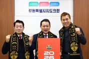 서울복지타임즈 이재연 기자 | 강원특별자치도의회는 2026년 강원FC의 선전과 도내 축구 열기 확산을 위해 ‘시즌권 구매-기부 릴레이’에 동참한다. 강원특별자치도의회 의장 김시성과 김병지 강원FC 대표이사는 1월 14일 도의회 의장 집무실에서 강원FC 시즌권 구매-기부 릴레이를 진행했다. 이번 릴레이를 통해 강원특별자치도의회 명의로 기부된 시즌권은 평소 프로축구를 접하기 어려운 아동과 청소년에게 전달되어 도민 화합과 축구 저변확대에 기여할 것으로 기대된다. 도의회 김시성 의장은 “올 한해도 강원FC가 한 단계 더 도약하고 성장할수 있도록 지속적인 관심을 기울이겠다”며, “강원FC가 도민들에게 화합과 행복을 주는 구단으로 발전하기를 응원한다”고 말했다.
