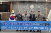 서울복지타임즈 이재연 기자 | 담양군·함평군·영광군·장성군 전남 4개 군의회 의장단은 30일 영광군의회에서 전남–광주 행정통합을 염원하는 공동 퍼포먼스에 참여했다. 이번 퍼포먼스는 행정구역의 경계를 넘어 전남과 광주가 하나의 생활권이자 경제권으로 나아가기 위한 의지와 공감대를 확인하기 위해 마련됐다. 특히 지역 간 협력과 상생 발전의 필요성에 대해 지방의회 차원에서 뜻을 모았다는 점에서 의미를 더했다. 의장단은 이날 “행정통합은 지역의 미래 경쟁력 확보와 균형발전을 위해 더 이상 미룰 수 없는 중요한 과제”라며, “지금이야말로 전남과 광주의 미래를 결정할 최고의 적기”라고 입을 모았다. 장성군의회 심민섭 의장은 “각 시군 의회가 뜻을 모은 오늘의 행동이 향후 이어질 논의와 협력의 출발점이 되기를 기대한다”며, “군민의 목소리가 충분히 반영될 수 있도록 의회 차원의 역할을 지속해 나가겠다”고 강조했다. 한편, 4개 시군 의회는 앞으로도 전남–광주 상생과 공동 발전을 위한 논의와 협력을 이어갈 계획이다.